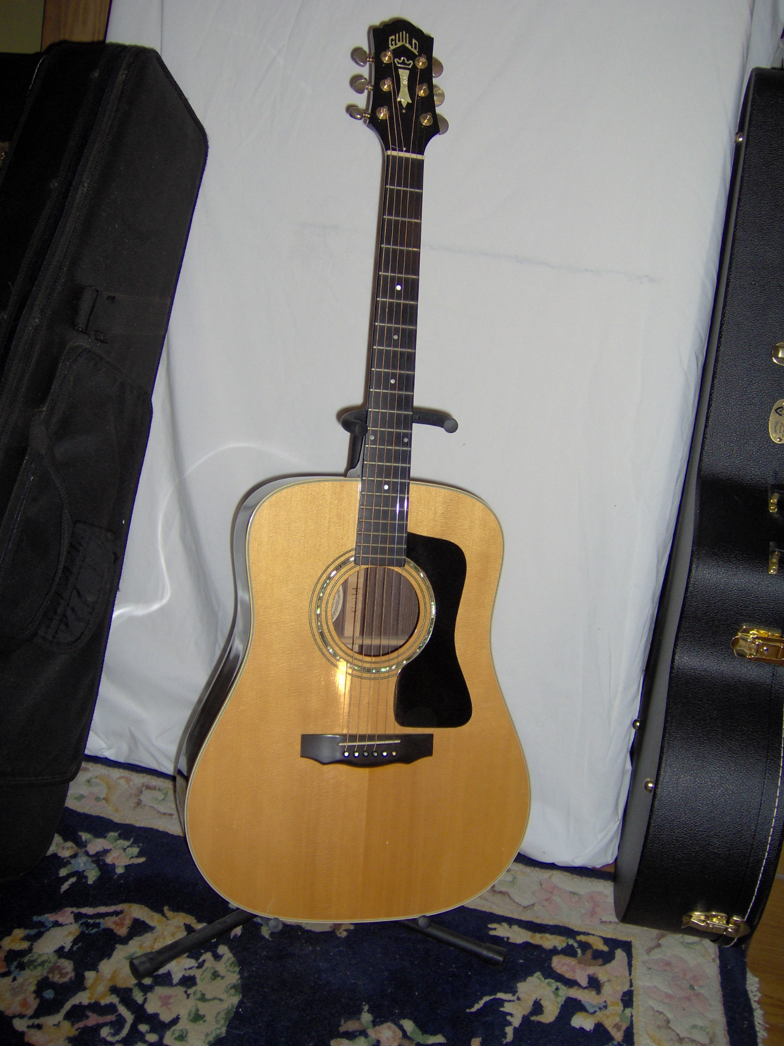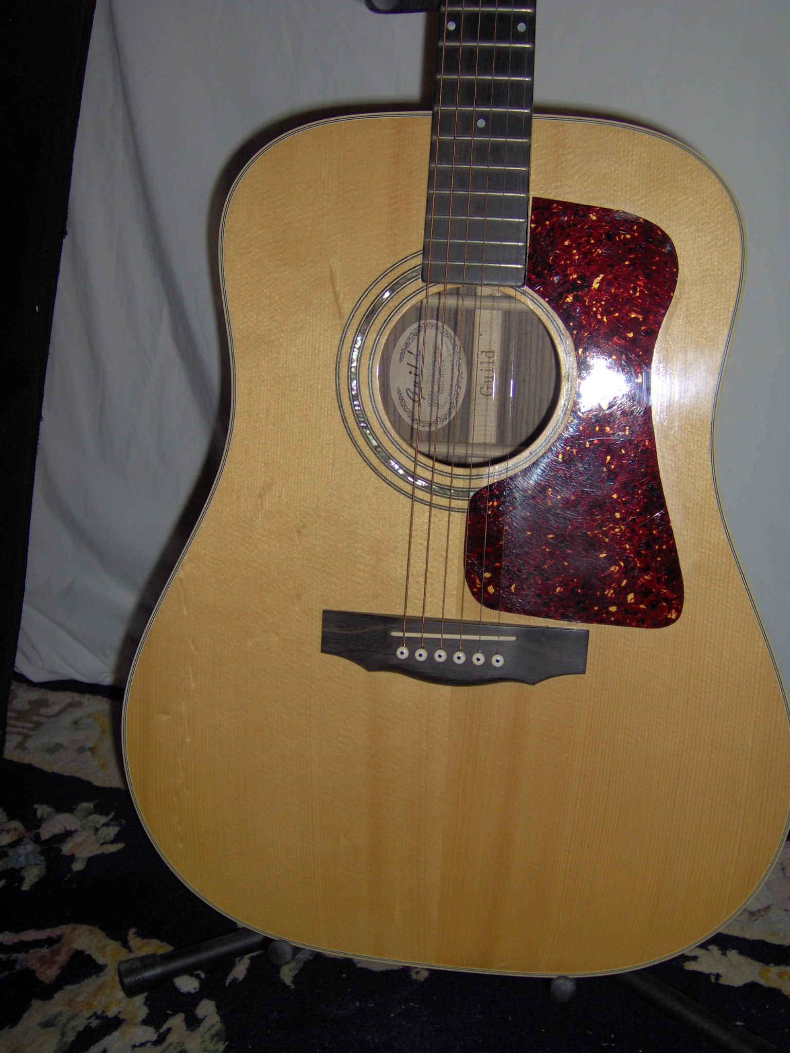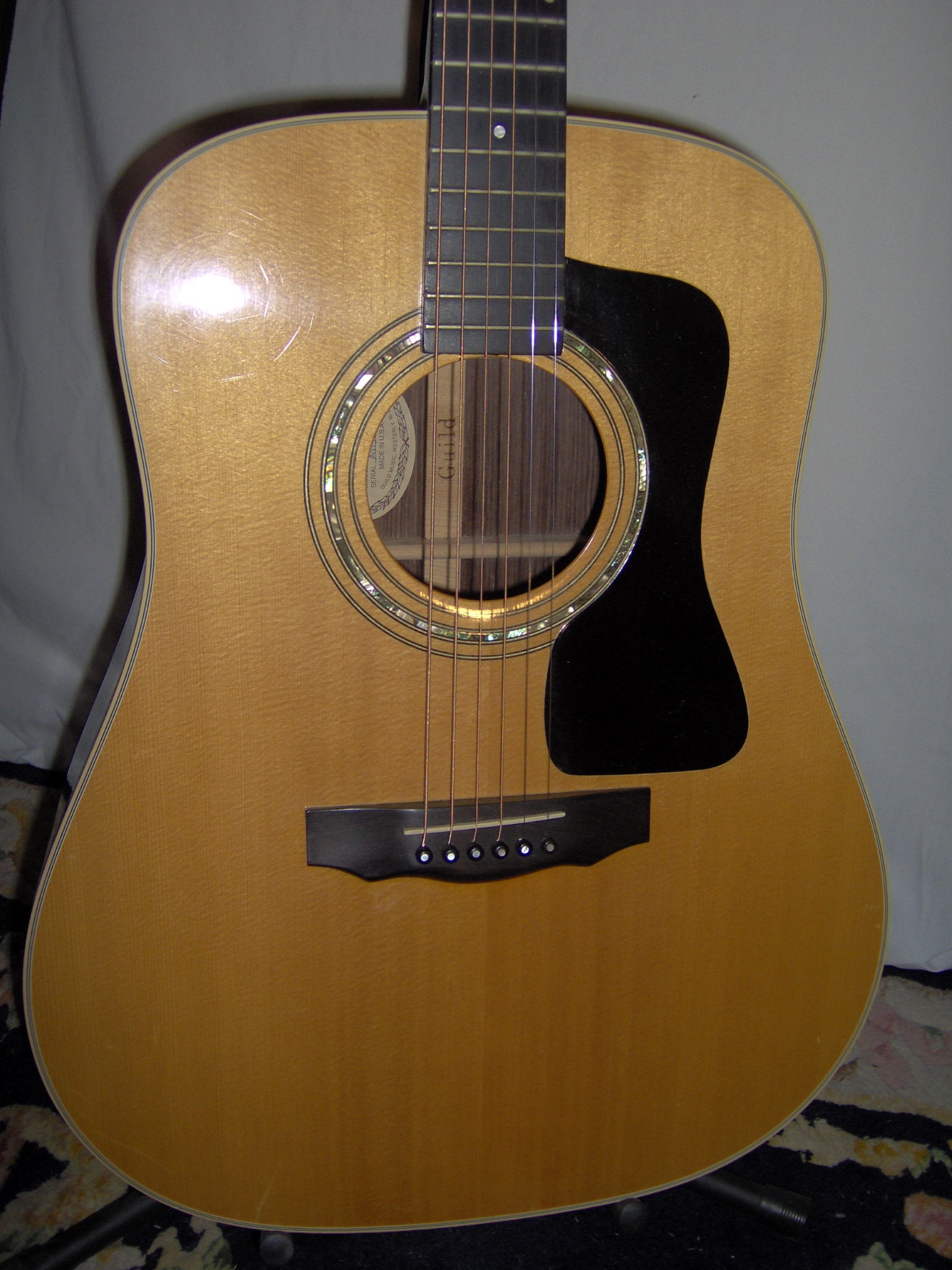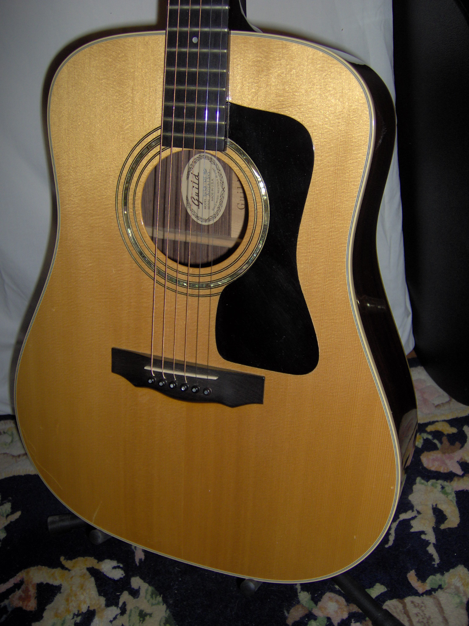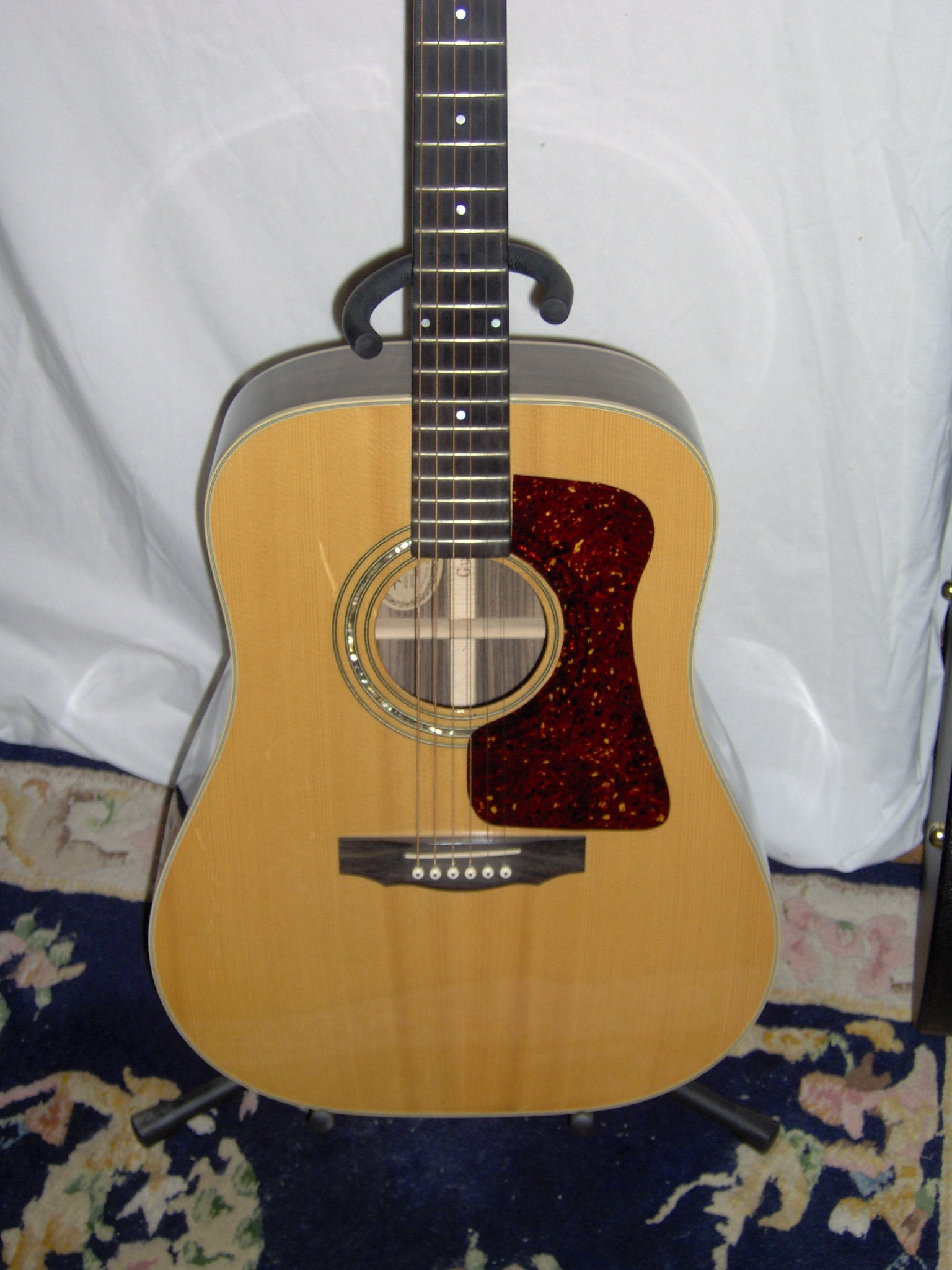 Well, here it is. 1996 Guild DV 52 NT HG. 1) The discerning eye will note that I reversed the 3 and 4 strings when I put new strings on the guitar just before the photo. I fixed that later. 2) Scratch on lower bout about even with the top of the bridge on the very end. Other very minor dings in the finish that show up as light flashes in some cases, but are hard to see with the eye unless the guitar is turned just right.