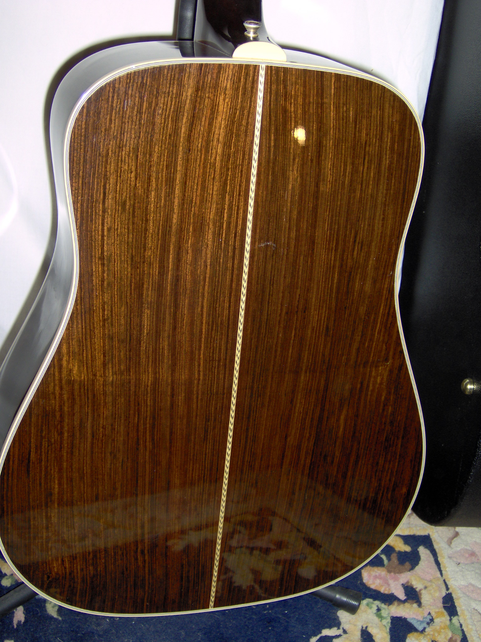The back is pretty clean, there are two belt buckle mars. One shows up in this shot, the other one is very similiar but does not present itself. Look below the camera flash about twice the distance from the flash to the top and to the right of the herringbone center stripe. Also note the brown rosewood, a sharp contrast to the greyish-brown rosewood in later years.